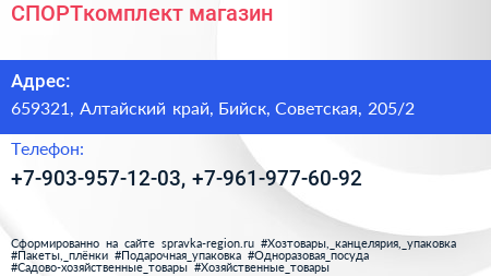СПОРТкомплект, магазин по адресу 659321, Алтайский край, Бийск, Советская, 205/2 в дальнейшем Организация, размещена в следующих категориях: