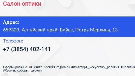 Салон оптики по адресу 659303, Алтайский край, Бийск, Петра Мерлина, 13 в дальнейшем Организация, размещена в следующих категориях: