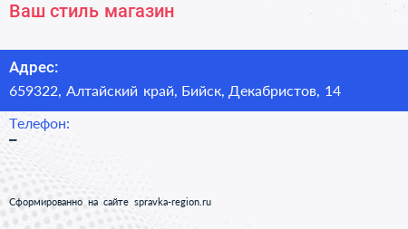 Ваш стиль, магазин по адресу 659322, Алтайский край, Бийск, Декабристов, 14 в дальнейшем Организация, размещена в следующих категориях:
