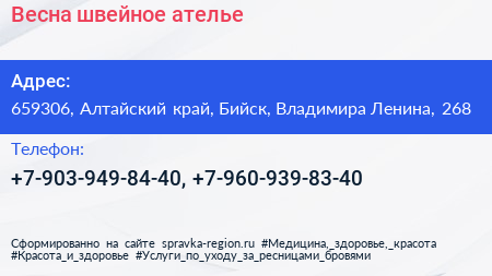 Весна, швейное ателье по адресу 659306, Алтайский край, Бийск, Владимира Ленина, 268 в дальнейшем Организация, размещена в следующих категориях: