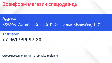 Военформ, магазин спецодежды по адресу 659306, Алтайский край, Бийск, Ильи Мухачёва, 147 в дальнейшем Организация, размещена в следующих категориях: