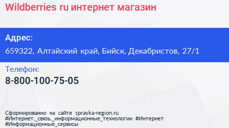 Wildberries.ru, интернет-магазин по адресу 659322, Алтайский край, Бийск, Декабристов, 27/1 в дальнейшем Организация, размещена в следующих категориях: