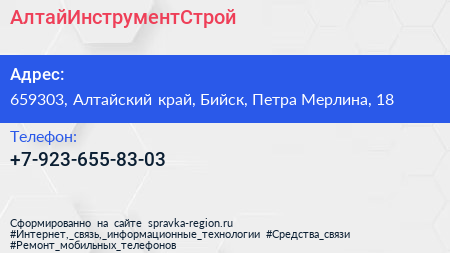 АлтайИнструментСтрой по адресу 659303, Алтайский край, Бийск, Петра Мерлина, 18 в дальнейшем Организация, размещена в следующих категориях: