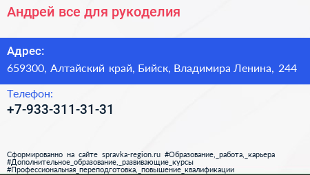 Андрей все для рукоделия по адресу 659300, Алтайский край, Бийск, Владимира Ленина, 244 в дальнейшем Организация, размещена в следующих категориях: