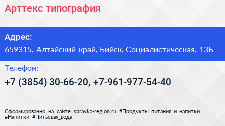 Арттекс, типография по адресу 659315, Алтайский край, Бийск, Социалистическая, 13Б в дальнейшем Организация, размещена в следующих категориях: