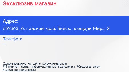 Эксклюзив, магазин по адресу 659363, Алтайский край, Бийск, площадь Мира, 2 в дальнейшем Организация, размещена в следующих категориях: