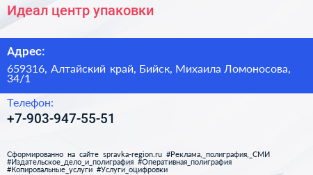 Идеал, центр упаковки по адресу 659316, Алтайский край, Бийск, Михаила Ломоносова, 34/1 в дальнейшем Организация, размещена в следующих категориях: