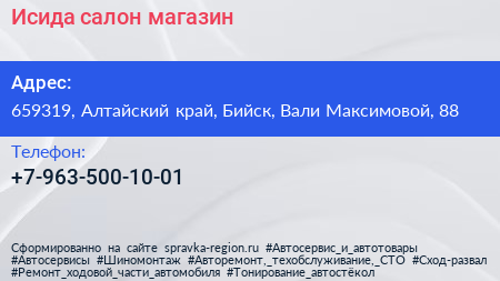 Исида, салон-магазин по адресу 659319, Алтайский край, Бийск, Вали Максимовой, 88 в дальнейшем Организация, размещена в следующих категориях: