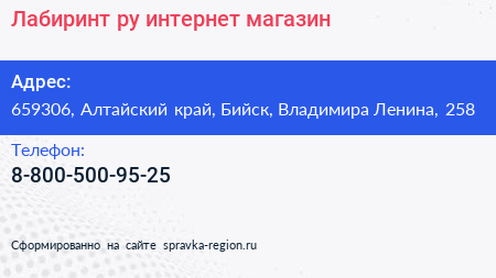 Лабиринт.ру, интернет-магазин по адресу 659306, Алтайский край, Бийск, Владимира Ленина, 258 в дальнейшем Организация, размещена в следующих категориях: