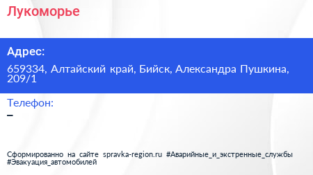 Лукоморье по адресу 659334, Алтайский край, Бийск, Александра Пушкина, 209/1 в дальнейшем Организация, размещена в следующих категориях: