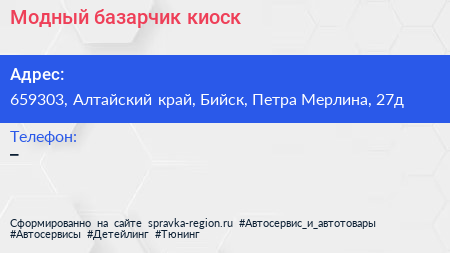 Модный базарчик, киоск по адресу 659303, Алтайский край, Бийск, Петра Мерлина, 27д в дальнейшем Организация, размещена в следующих категориях: