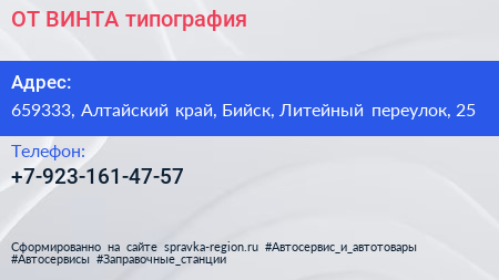 ОТ ВИНТА!, типография по адресу 659333, Алтайский край, Бийск, Литейный переулок, 25 в дальнейшем Организация, размещена в следующих категориях: