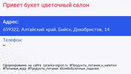 Привет букет, цветочный салон по адресу 659322, Алтайский край, Бийск, Декабристов, 14 в дальнейшем Организация, размещена в следующих категориях: