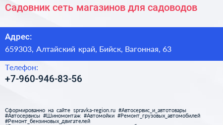 Садовник, сеть магазинов для садоводов по адресу 659303, Алтайский край, Бийск, Вагонная, 63 в дальнейшем Организация, размещена в следующих категориях: