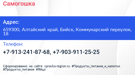 Самогошка по адресу 659300, Алтайский край, Бийск, Коммунарский переулок, 18 в дальнейшем Организация, размещена в следующих категориях: