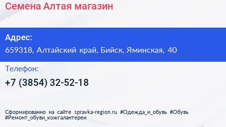 Семена Алтая, магазин по адресу 659318, Алтайский край, Бийск, Яминская, 40 в дальнейшем Организация, размещена в следующих категориях: