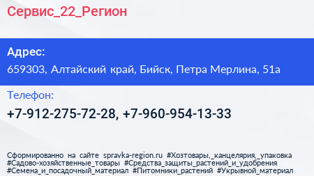 Сервис_22_Регион по адресу 659303, Алтайский край, Бийск, Петра Мерлина, 51а в дальнейшем Организация, размещена в следующих категориях: