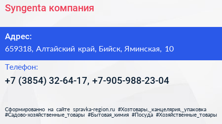 Syngenta, компания по адресу 659318, Алтайский край, Бийск, Яминская, 10 в дальнейшем Организация, размещена в следующих категориях: