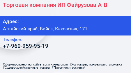 Торговая компания, ИП Файрузова А.В. по адресу Алтайский край, Бийск, Каховская, 171 в дальнейшем Организация, размещена в следующих категориях: