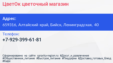 ЦветОк, цветочный магазин по адресу 659316, Алтайский край, Бийск, Ленинградская, 40 в дальнейшем Организация, размещена в следующих категориях:
