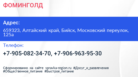 ФОМИНГОЛД по адресу 659323, Алтайский край, Бийск, Московский переулок, 125а в дальнейшем Организация, размещена в следующих категориях: