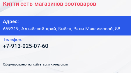 Китти, сеть магазинов зоотоваров по адресу 659319, Алтайский край, Бийск, Вали Максимовой, 88 в дальнейшем Организация, размещена в следующих категориях: