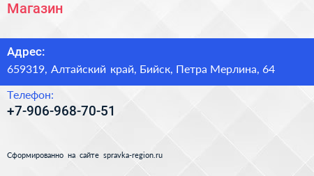 Магазин по адресу 659319, Алтайский край, Бийск, Петра Мерлина, 64 в дальнейшем Организация, размещена в следующих категориях: