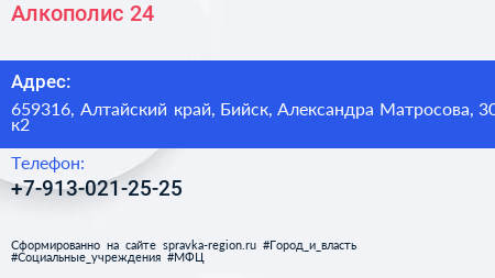 Алкополис 24 по адресу 659316, Алтайский край, Бийск, Александра Матросова, 30 к2 в дальнейшем Организация, размещена в следующих категориях:
