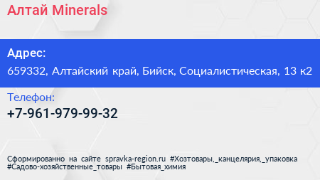 Алтай Minerals по адресу 659332, Алтайский край, Бийск, Социалистическая, 13 к2 в дальнейшем Организация, размещена в следующих категориях: