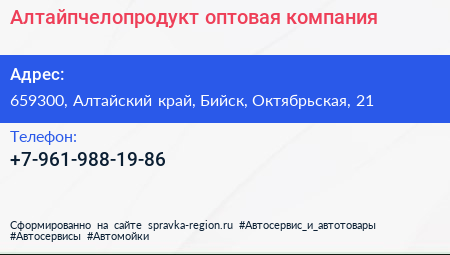Алтайпчелопродукт, оптовая компания по адресу 659300, Алтайский край, Бийск, Октябрьская, 21 в дальнейшем Организация, размещена в следующих категориях: