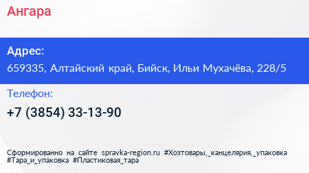 Ангара по адресу 659335, Алтайский край, Бийск, Ильи Мухачёва, 228/5 в дальнейшем Организация, размещена в следующих категориях: