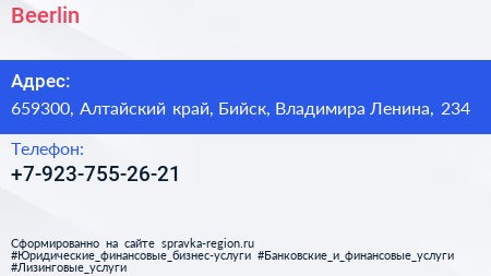 Beerlin по адресу 659300, Алтайский край, Бийск, Владимира Ленина, 234 в дальнейшем Организация, размещена в следующих категориях: