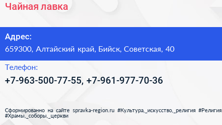Чайная лавка по адресу 659300, Алтайский край, Бийск, Советская, 40 в дальнейшем Организация, размещена в следующих категориях: