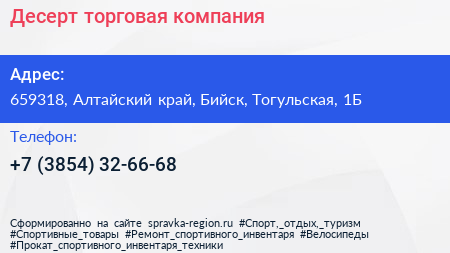 Десерт, торговая компания по адресу 659318, Алтайский край, Бийск, Тогульская, 1Б в дальнейшем Организация, размещена в следующих категориях: