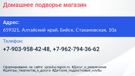 Домашнее подворье, магазин по адресу 659321, Алтайский край, Бийск, Стахановская, 10а в дальнейшем Организация, размещена в следующих категориях: