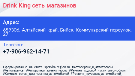 Drink King, сеть магазинов по адресу 659306, Алтайский край, Бийск, Коммунарский переулок, 27 в дальнейшем Организация, размещена в следующих категориях: