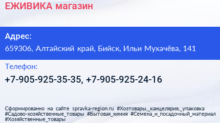 ЕЖИВИКА, магазин по адресу 659306, Алтайский край, Бийск, Ильи Мухачёва, 141 в дальнейшем Организация, размещена в следующих категориях: