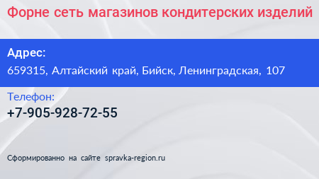 Форне, сеть магазинов кондитерских изделий по адресу 659315, Алтайский край, Бийск, Ленинградская, 107 в дальнейшем Организация, размещена в следующих категориях: