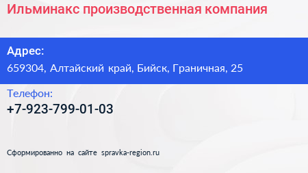 Ильминакс, производственная компания по адресу 659304, Алтайский край, Бийск, Граничная, 25 в дальнейшем Организация, размещена в следующих категориях: