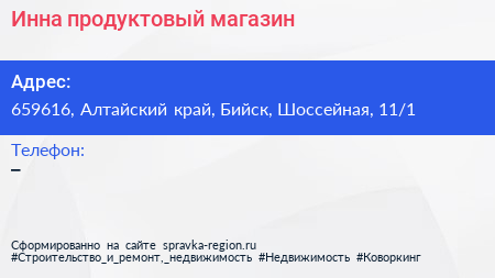 Инна, продуктовый магазин по адресу 659616, Алтайский край, Бийск, Шоссейная, 11/1 в дальнейшем Организация, размещена в следующих категориях: