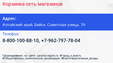 Корзинка, сеть магазинов по адресу Алтайский край, Бийск, Советская улица, 74 в дальнейшем Организация, размещена в следующих категориях: