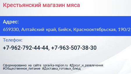 Крестьянский, магазин мяса по адресу 659330, Алтайский край, Бийск, Краснооктябрьская, 190/2 в дальнейшем Организация, размещена в следующих категориях: