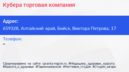 Кубера, торговая компания по адресу 659328, Алтайский край, Бийск, Виктора Петрова, 17 в дальнейшем Организация, размещена в следующих категориях: