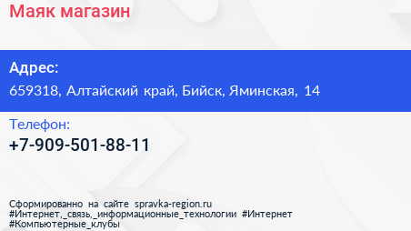 Маяк, магазин по адресу 659318, Алтайский край, Бийск, Яминская, 14 в дальнейшем Организация, размещена в следующих категориях: