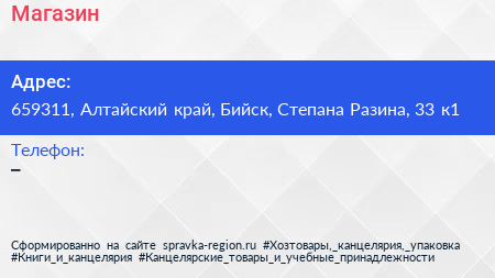 Магазин по адресу 659311, Алтайский край, Бийск, Степана Разина, 33 к1 в дальнейшем Организация, размещена в следующих категориях: