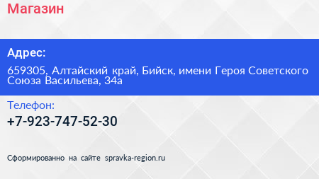 Магазин по адресу 659305, Алтайский край, Бийск, имени Героя Советского Союза Васильева, 34а в дальнейшем Организация, размещена в следующих категориях: