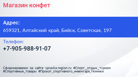 Магазин конфет по адресу 659321, Алтайский край, Бийск, Советская, 197 в дальнейшем Организация, размещена в следующих категориях: