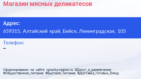 Магазин мясных деликатесов по адресу 659315, Алтайский край, Бийск, Ленинградская, 105 в дальнейшем Организация, размещена в следующих категориях: