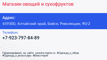 Магазин овощей и сухофруктов по адресу 659300, Алтайский край, Бийск, Революции, 90/2 в дальнейшем Организация, размещена в следующих категориях: