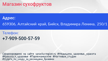 Магазин сухофруктов по адресу 659306, Алтайский край, Бийск, Владимира Ленина, 250/1 в дальнейшем Организация, размещена в следующих категориях: